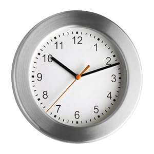 Aluminium gebürstet Ziffernblatt weiß Zeiger schwarz und orange Durchmesser 200 mm Tiefe 350mm Gewicht ca. 300 gr. Batterien enthalten